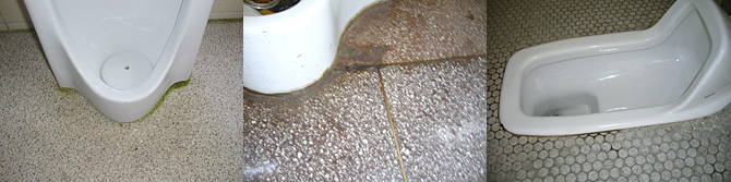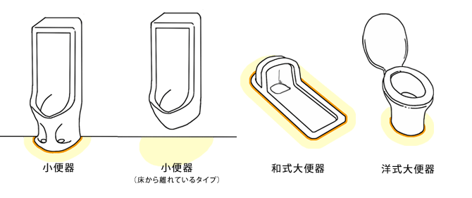 尿モレが原因で、便器(特に小便器、和式大便器)と床のすき間に浸み込み、尿石化が進み変色ししてトイレ臭の原因となります。(上記図のオレンジ色で示した部分に尿モレが浸み込みやすい、黄色で示した部分に尿の飛び散りが多い。)