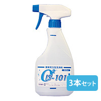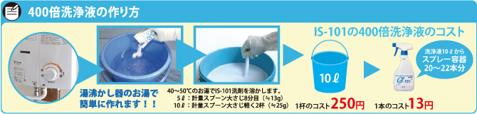 汚れの箇所に「酸素発生型洗浄剤IS-101 400倍」をスプレー容器またはブラシで浸します。(スプレー1回では1ccくらいの洗浄液で済みますので汚れを広範囲に8~12回の噴霧)翌朝まで水滴が残ることは殆どありません。